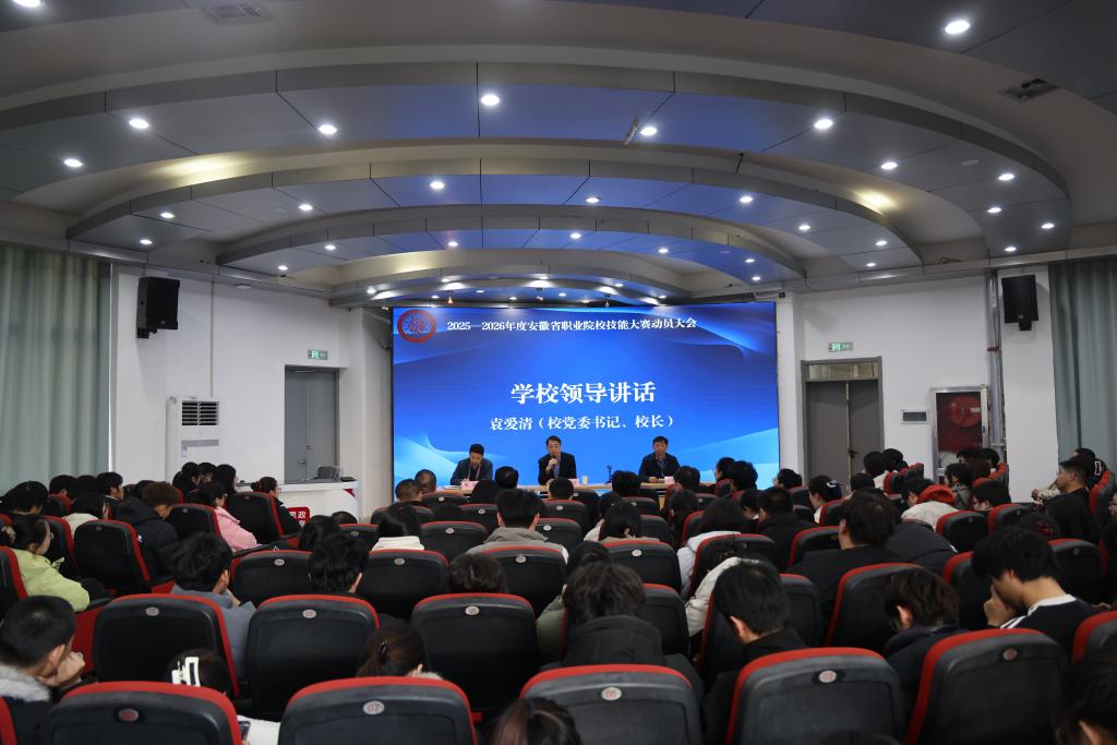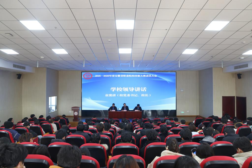 为全力备战2025—2026年度安徽省职业院校技能大赛,统一思想、凝聚共识、明确目标、鼓舞士气,1月16日,学校分别在春申湖校区和洞山校区召开专题动员大会。党委书记、校长袁爱清,校长助理周波出席会议,教务处负责人、二级学院院长、全体赛项指导教师和参赛选手参加会议。会议由副校长凌总成主持。