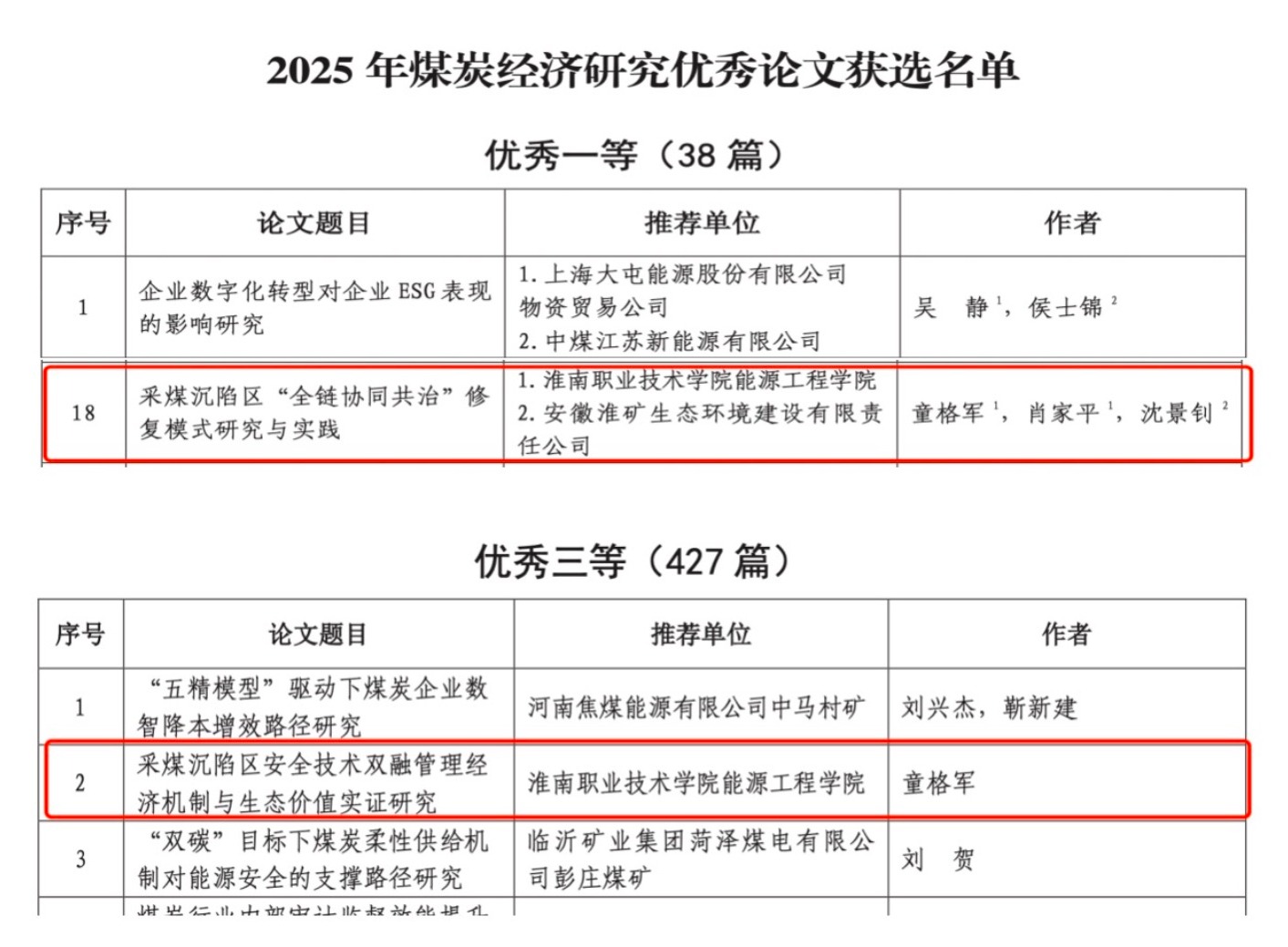 日前,中国煤炭经济研究会公布2025年煤炭经济研究优秀论文评选结果。在全国1307篇参评成果中,我校能源工程学院童格军、肖家平老师牵头完成的《采煤沉陷区“全链协同共治”修复模式研究与实践》获评优秀一等,童格军老师的《采煤沉陷区安全技术双融管理经济机制与生态价值实证研究》获评优秀三等,获奖层次与数量再创佳绩。