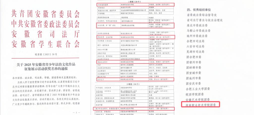 近日,由共青团安徽省委、省委政法委、省司法厅、省学生联合会共同主办的2025年安徽省青少年法治文化作品征集展示活动获奖结果揭晓。学校荣获5个二等奖、1个三等奖,涵盖法治图画与法治歌曲两类作品。校团委获优秀组织单位。