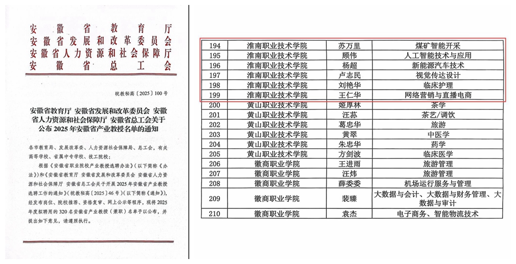 近日,安徽省教育厅、安徽省发展和改革委员会、安徽省人力资源与社会保障厅、安徽省总工会联合公布2025年安徽省产业教授名单,学校推荐的卢志民等6人成功入选。